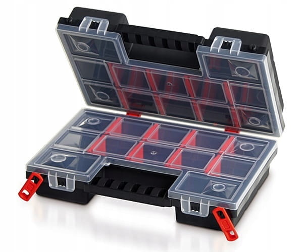 Praktyczny i pojemny organizer z trzema rzędami przegródek umożliwia umieszczenie dużej ilości drobnych przedmiotów takich jak gwoździe, kołki rozporowe, wkręty, śruby i nakrętki, wiertła itp. Organizer marki Kistenberg to nie tylko świetne rozwiązanie w garażu lub warsztacie, ale także fantastyczny pomocnik w utrzymaniu porządku w domu lub mieszkaniu. Każda Pani domu doceni jego możliwości - bez trudu poukłada i uporządkuje guziki, nitki, wstążki, gumki i inne tak niezbędne drobiazgi. Przegrody mają możliwość regulacji długości, co pozwala dopasować ich wielkość do potrzebnego rozmiaru. Dzięki przezroczystej pokrywie bez otwierania organizera można rozpoznać jego zawartość. Dzięki specjalnym złączkom dwa organizery można ze sobą połączyć. Szeroka rączka oraz solidne zatrzaski do zamykania to kolejne atuty praktycznego organizera. Produkt został wykonany z wysokiej jakości materiałów, co zapewnia jego trwałość i wytrzymałość.